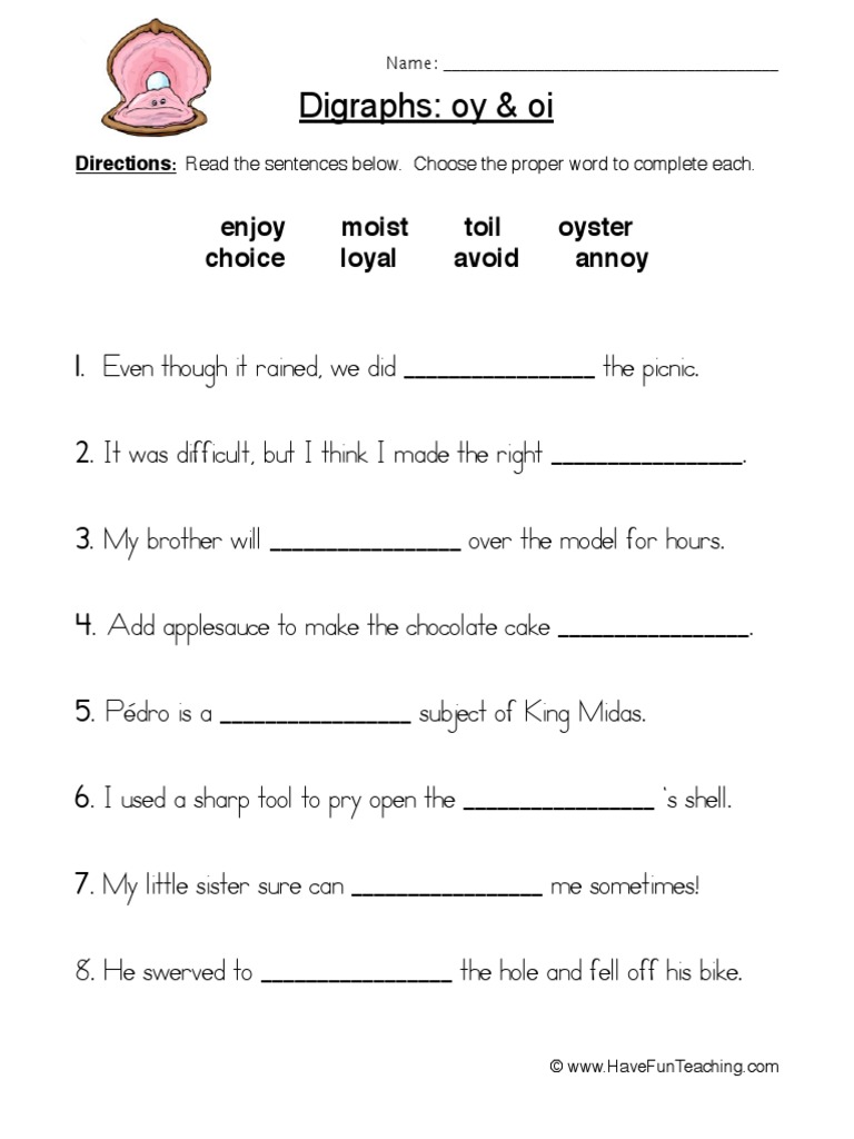 Phonics games worksheet oi sounds worksheets diphthongs learn short vowel i for kindergarten oi worksheets free worksheets library download and print. In kindergarten, students learn that the letters ch together sound like a the technical term for two letters creating one sound is digraph. Ee, ea, ai, oa, oo, au, ea, ie, ou, ui (more correctly these are vowel combinations composed of digraphs and diphthongs ). Showing 8 worksheets for oi digraphs. Being able to fill in a blank builds your students critical thinking ability.